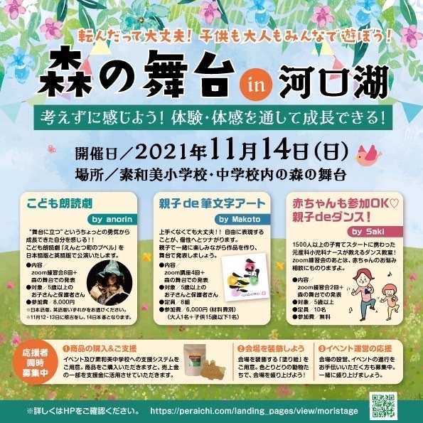 11月14日(日)に山梨県『森の舞台in河口湖』で行われる、「えんとつ町のプペル」こども朗読劇。大人気の英語版が僅か3日で売り切れたため、今回、追加公演が決定!日本語版も10/5まで、申し込みを延長しました。同日開催の、親子de筆文字アート、親子ダンスも、絶賛参加者を募集中です。