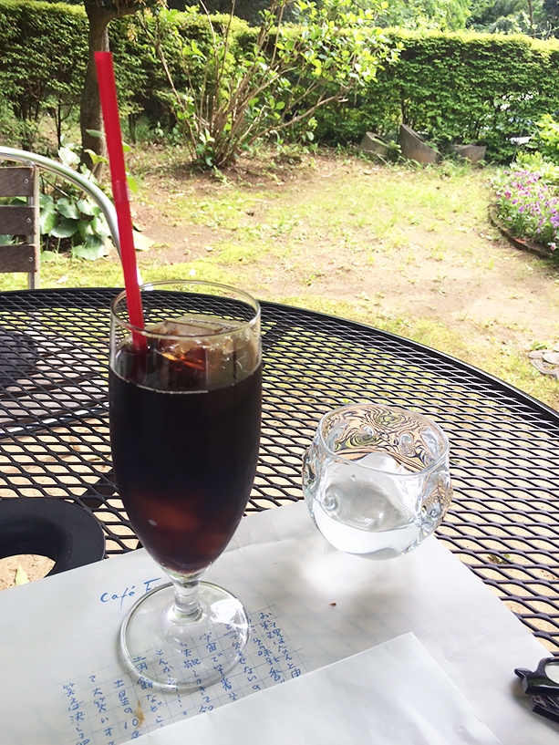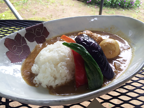 このお店のお気に入りメニューは野菜を使ったカレー。当日は天気がよかったのでカレーとアイスコーヒーを注文して外の席へ。